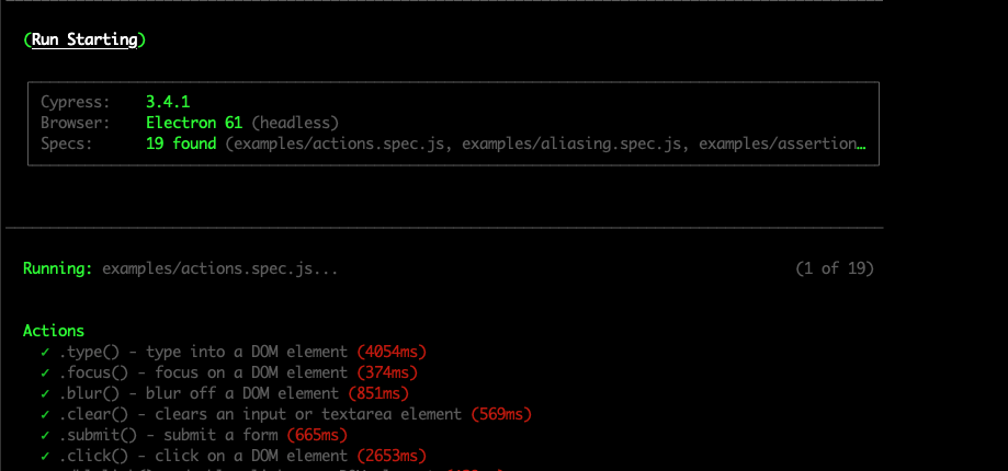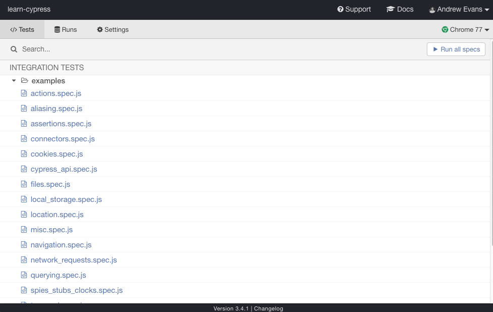You should also notice that Cypress right out of the box has several examples in the /cypress/integration/examples folder. These are really helpful when you’re first getting started. If you click “run all specs” you’ll see it run through the examples one file at a time.