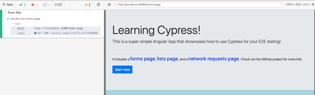 So lets go ahead and add that to a new test, where we go to the home page, and click the start button like so: