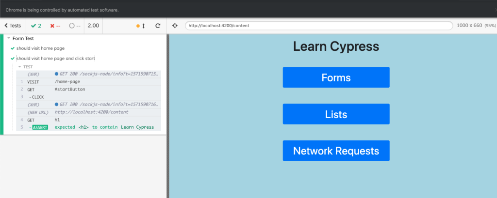 It’s really incredible to see it all in action. When you run Cypress it opens a Chrome Browser and has your application running on the right with the Cypress test history on the left: