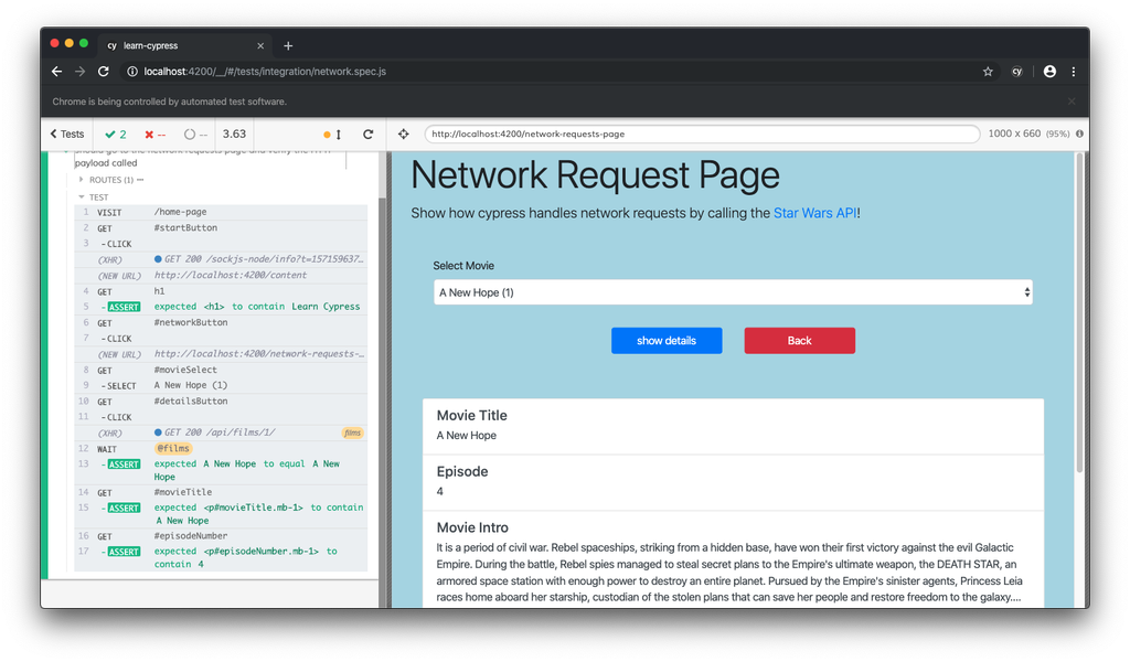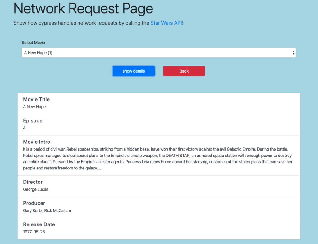 If you navigate over to my sample project’s “Network Requests” page you’ll see that it asks you to pick a Star Wars movie. Once you’ve selected the movie, if you click “show details” it calls the Star Wars API and retrieves some details.