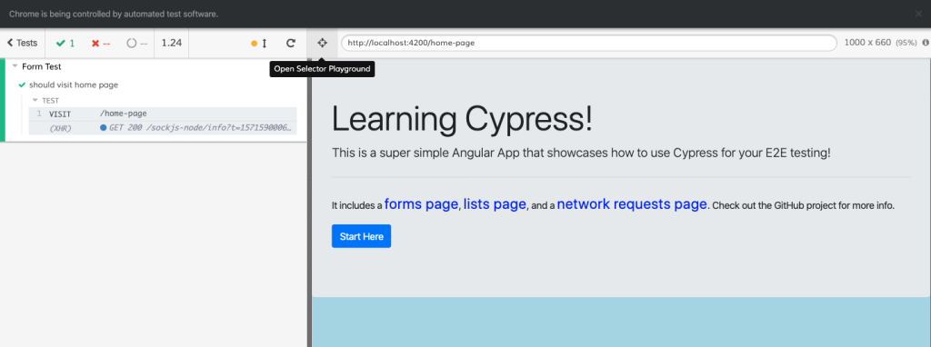 Go back to the first_test.spec.js file from before. Run the test, and when it finishes click on the Playground Selector. Next click on the “start” button.