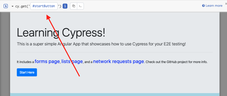 We’re going to find the start button on the home page, and then pass a click event to it. If you notice in the screenshot here, the “Cypress Selector Playground” tooltip is highlighted. We’ll need to click on that to turn that on. Once it’s on, you can select anything on the page and Cypress will generate the “cy.get” code for whatever element you’re trying to interact with.