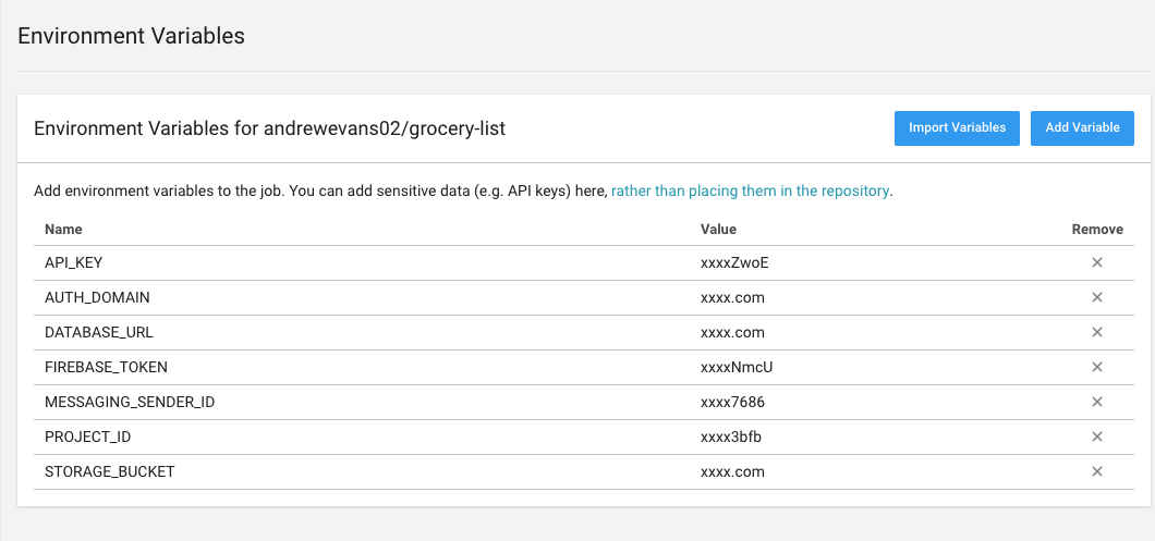 So for my project, I first took the Firebase Credentials and put them into environment variables in my CircleCI project (following the instructions above). The end result looked something like this: