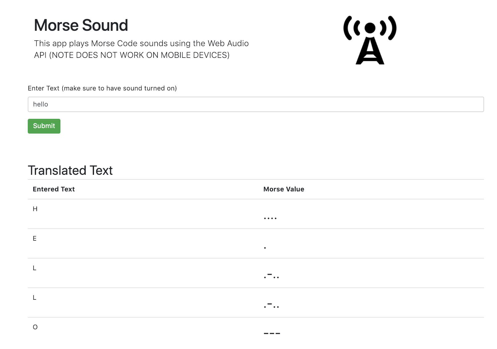 The app itself just takes in text, plays the text as Morse Code and also outputs the translated result as in the following screenshot.