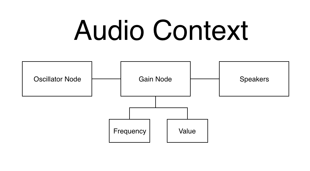 In the graph here, all of the nodes exist within an AudioContext. The three Nodes that are listed here are just part of the Audio Graph. The oscillator connects to the gain which then creates output that is sent to the Speakers (Audio Destination).