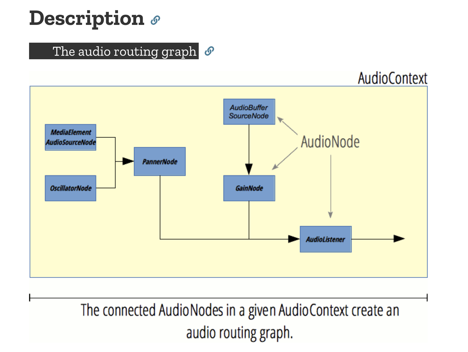 The Web Audio API is really a set of “nodes” that are different parts of a virtual network. You create this network to simulate sounds and connect a source (either recorded sound or generated) to a destination (speakers). The following is a great overall diagram I copied from the MDN pages here: