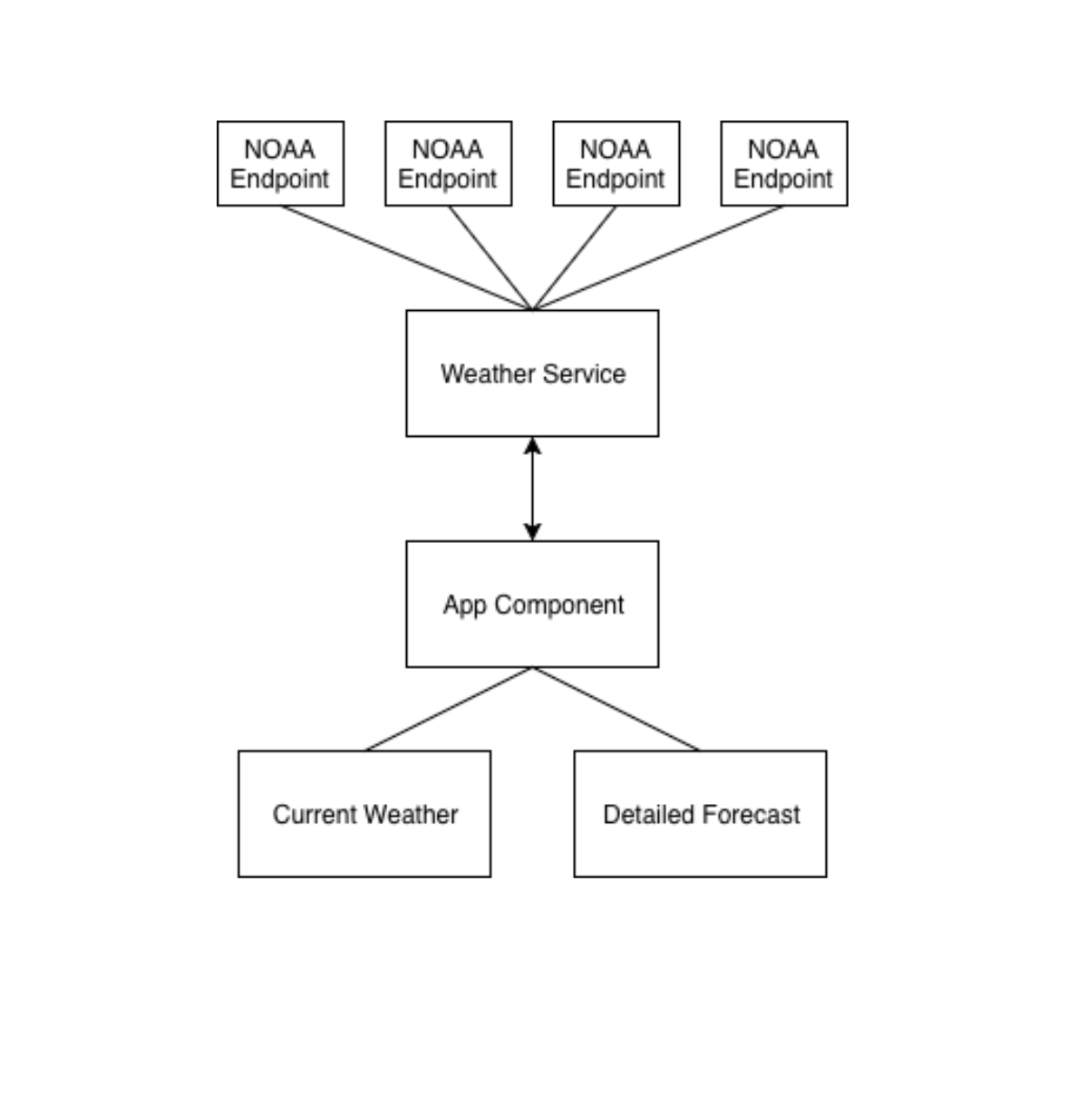 In most of the Angular apps that I’ve worked with previously, I had individual components that were essentially their own separate entities. In this case, I wanted to make sure that the same information captured about location was passed to the each component. So I created a setup where the main App component acts as a parent to child components for display. The actual data this shown is pulled in from HTTP GET calls to NOAA API endpoints. The resulting architecture looked like the following: